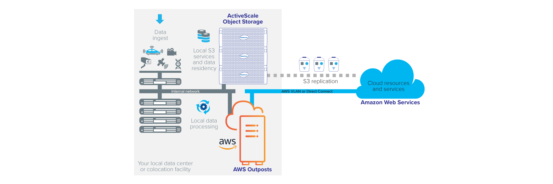 ActiveScale provides S3 services for AWS Outposts in support of latency-sensitive applications, ingest of data from local systems and devices, and local data processing, due to data center dependencies or to comply with data residency requirements.