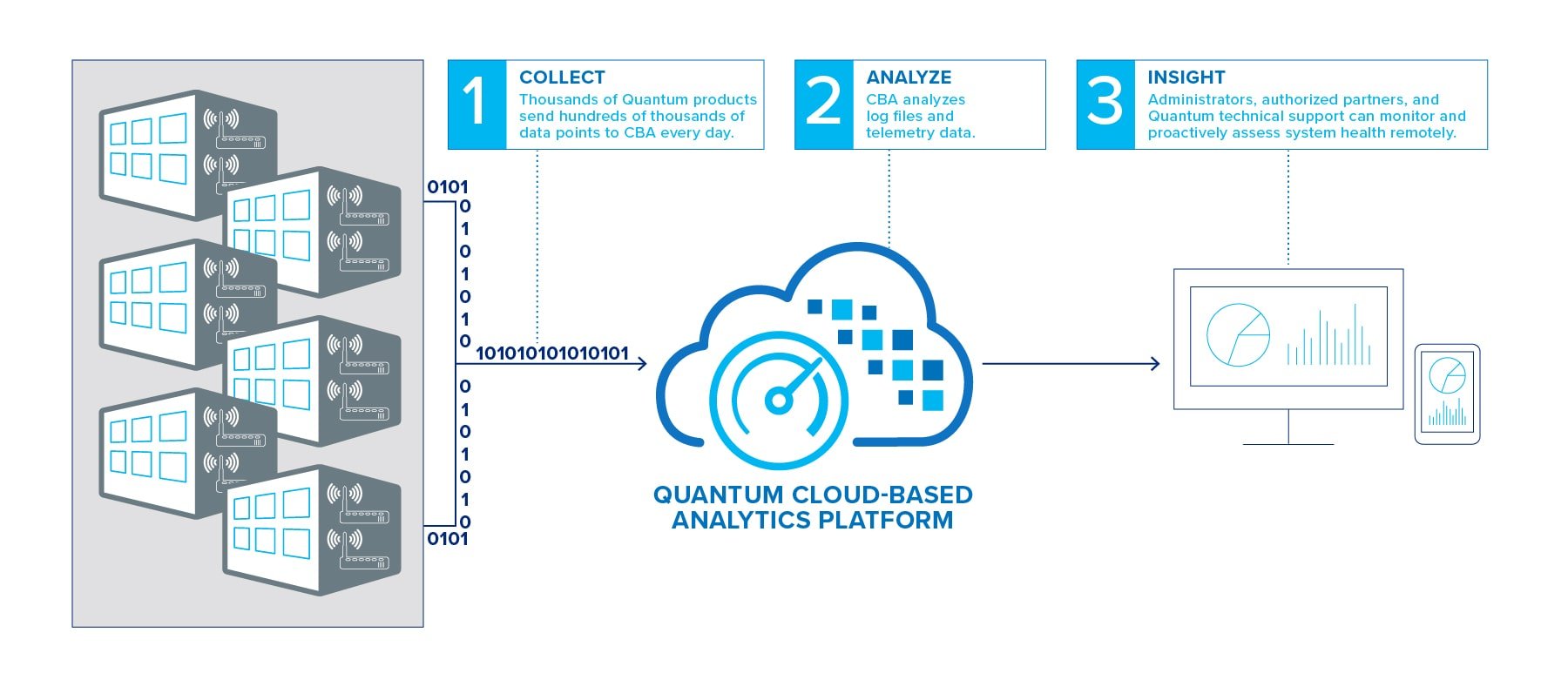 Quantum products are equipped with a CBA agent that can provide log files and snapshots to Quantum CBA servers that are running in the cloud. CBA will parse the log files and snapshots and then analyze the data to provide the information in a user-friendly web-based display to the end user.