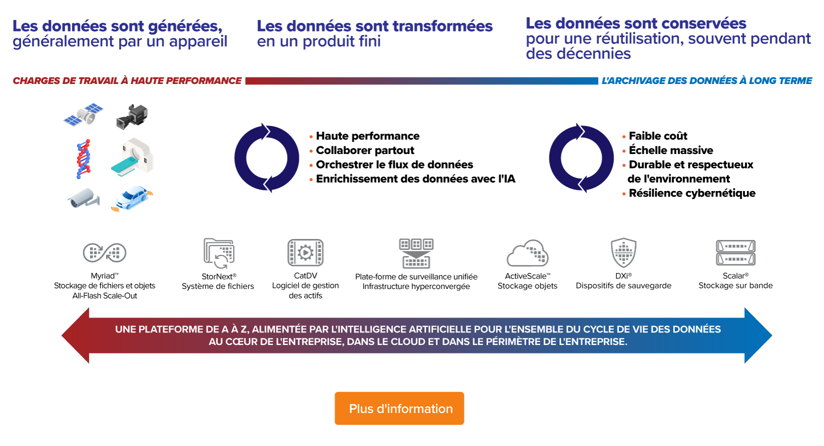 Quantum redéfinit la gestion du cycle de vie des données. Avec plus de 40 ans d'expertise dans le stockage avancé et la gestion des données, nos solutions intègrent de manière transparente le stockage flash hautes performances, la sauvegarde intelligente et l'archivage évolutif pour prendre en charge l'IA, l'analytique, les clouds privés et la cyber-résilience. Contrairement aux fournisseurs de stockage traditionnels, nos solutions cataloguent, étiquettent et organisent automatiquement les données, garantissant ainsi aux entreprises la possibilité de rechercher, d'analyser et d'exploiter des volumes de données massifs pour stimuler l'innovation. Avec Quantum, vos données sont prêtes pour la suite.
