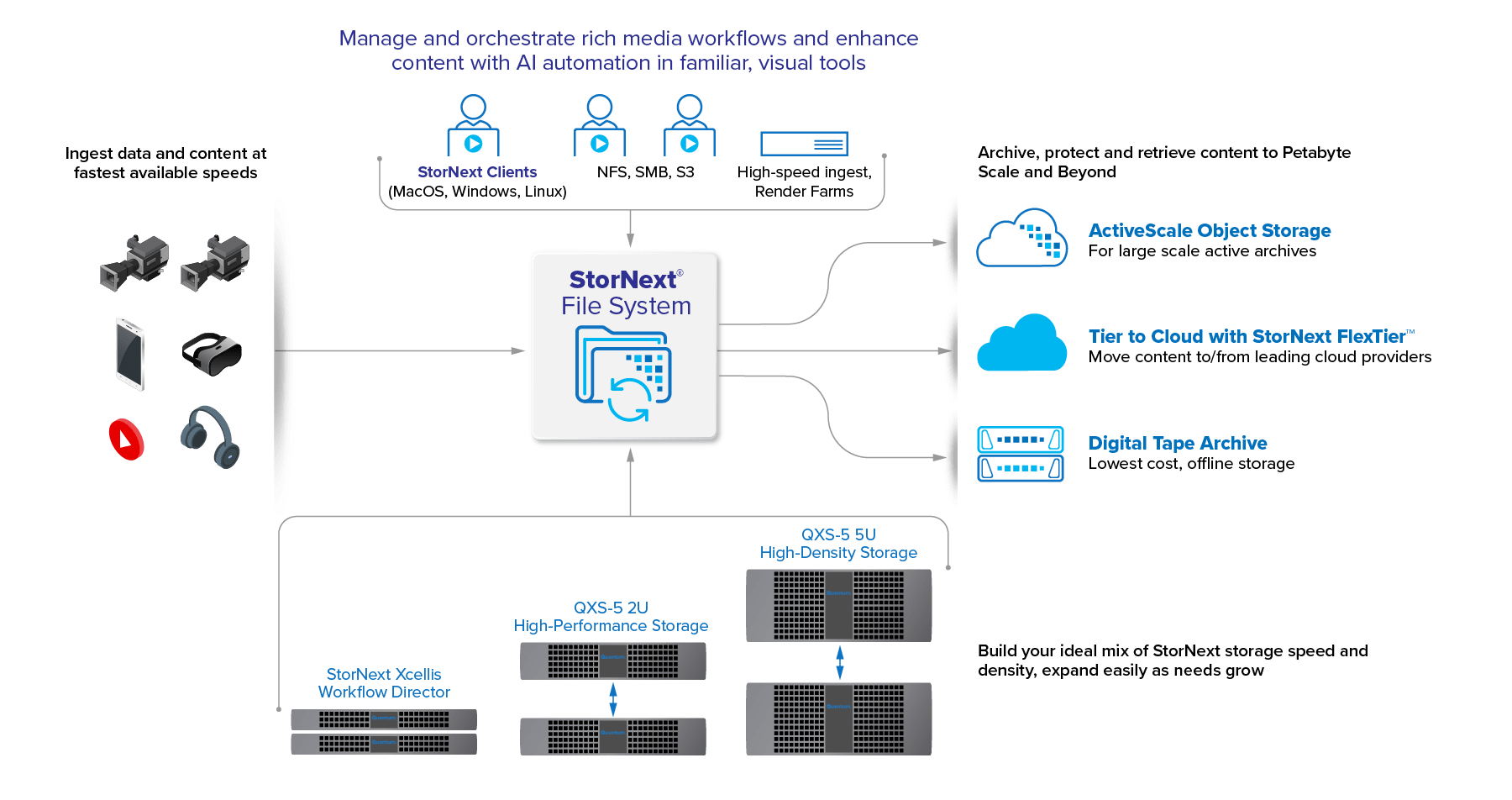 QXS-Series共有ストレージ・アプライアンスは、高速で可用性に優れ、拡張が容易なストレージであるのみならず、接続オプションやドライブのサイズ、フォーム・ファクターを自由に選んで構成していただけるため、StorNextや直接接続方式のワークフローのニーズに的確に対応することができます。
